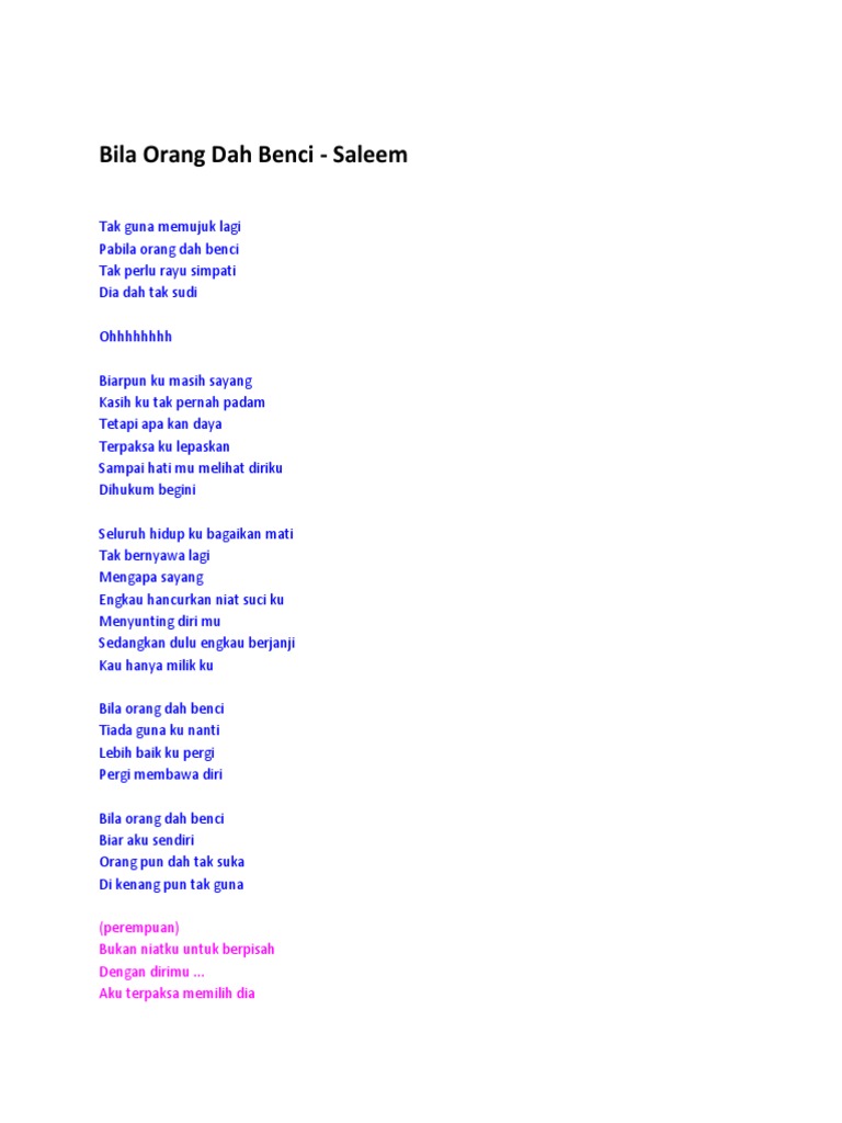 Bila Orang Dah Benci Saleem Lirik Youtube